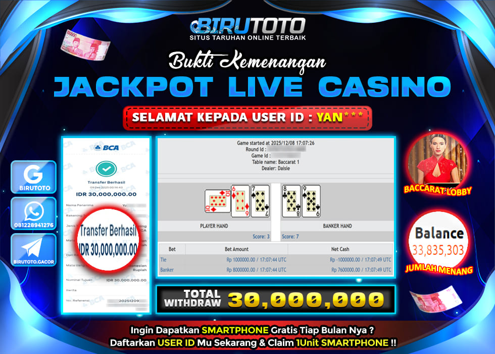 BIRUTOTO JACKPOT LIVE CASINO BACCARAT LOBBY Rp.30.000.000 LUNAS